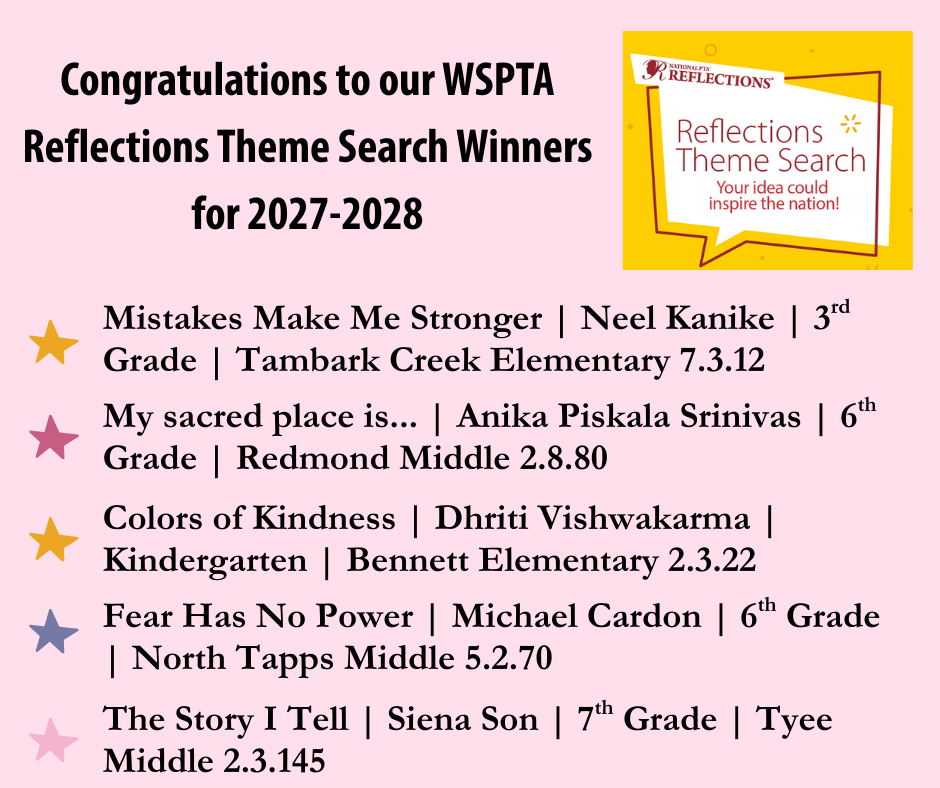 Click here to view the list of finalists for the 2024-2025 WSPTA Reflections Arts Contest. Congratulations to all our finalists and to all 700+ entrants!