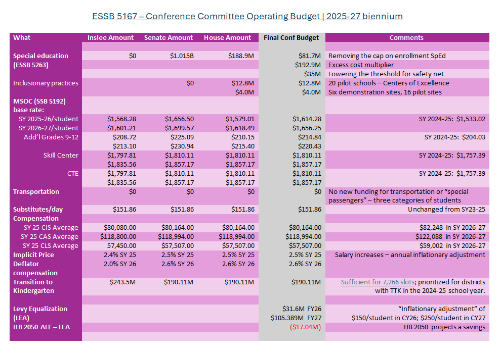 When the 2025-27 operating budget was revealed by the Conference Committee on Saturday, April 26th, one of the best bits of news was that the concept of reducing apportionment payments in February, March and April (and then returning them to school districts in the August apportionment) for the next two school years was nowhere to be found. The Legislature chose NOT to shift the apportionment and destabilize school districts and create cash flow issues.
